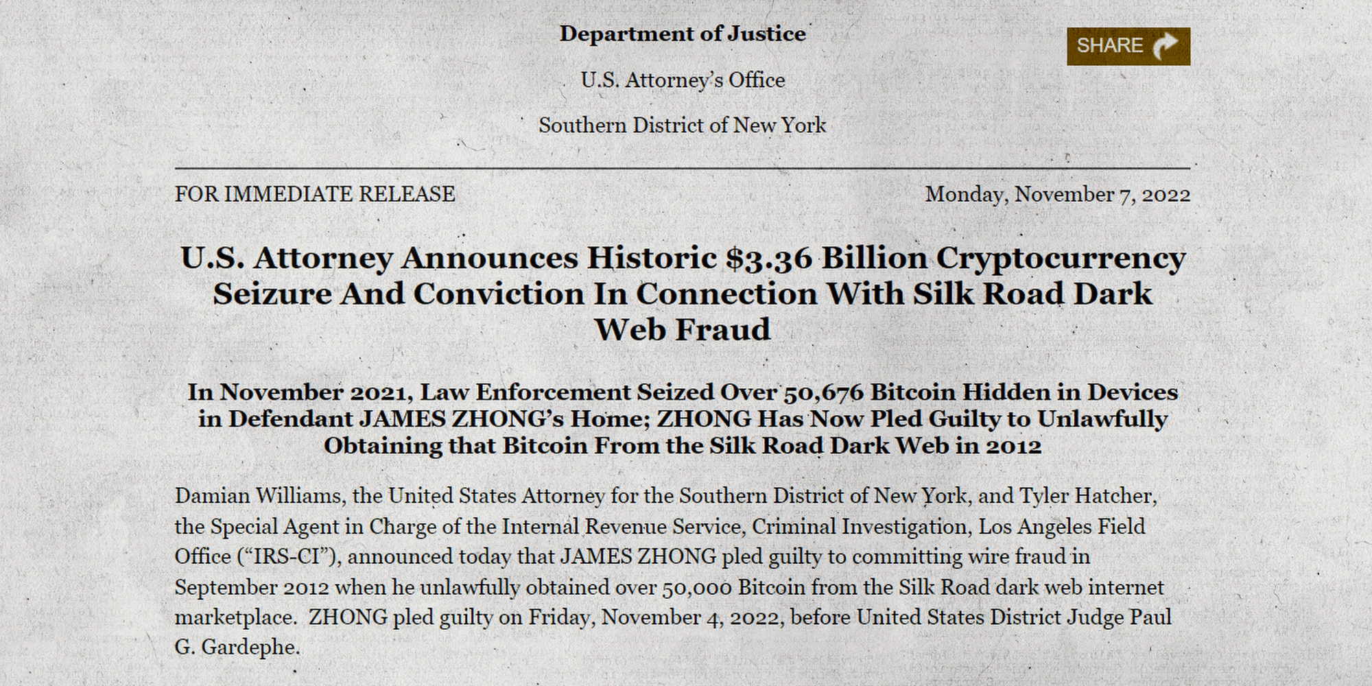 When the FBI shut down the Silk Road marketplace in October of 2013, they seized approximately 170,000 Bitcoinsfrom its founder Ross Ulbricht. However, the total commissions earned by Silk Road was believed to be about 614,000 Bitcoins. So, what happened to rest? Ross Ulbricht is on record saying that the vast majority of these proceeds were reinvested back into the Silk Road, but there has always been suspicions that some of these Bitcoins remained in circulation. Fast forward to November 7th, 2022, when the U.S. Justice Department revealed they executed a search warrant at the home of James Zhong, uncovering a stash of more than 50,000 Bitcoinswhich he had stolen from Silk Road nearly 10 years prior. These Bitcoins had a value of $3.38 billion dollars at the time they were seized, making it the largest amount of illicit funds ever recovered by law enforcement in terms of dollars. In this video I’m going to take you through the story of James Zhong, covering everything from his humble beginnings as a student at the University of Georgia, the 50,000 Bitcoin heist of Silk Road, his subsequent billionaire lifestyle, and ultimately the mistakes he made which led to him facing jailtime and the seizure of his ill-gotten gains.